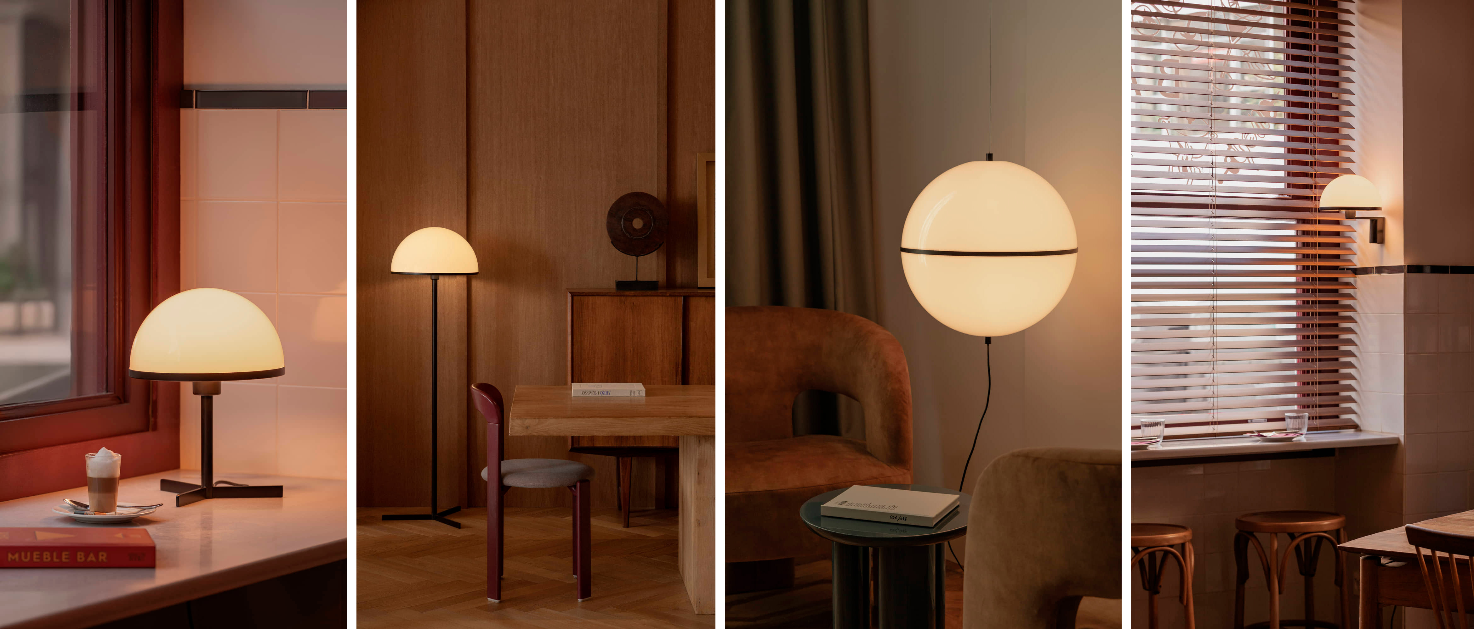 Dome’s identity is defined by its opal dome, which filters the light and spreads it evenly, creating a warm and enveloping glow. The result is a serene, timeless atmosphere designed to blend naturally into both residential and contract projects.