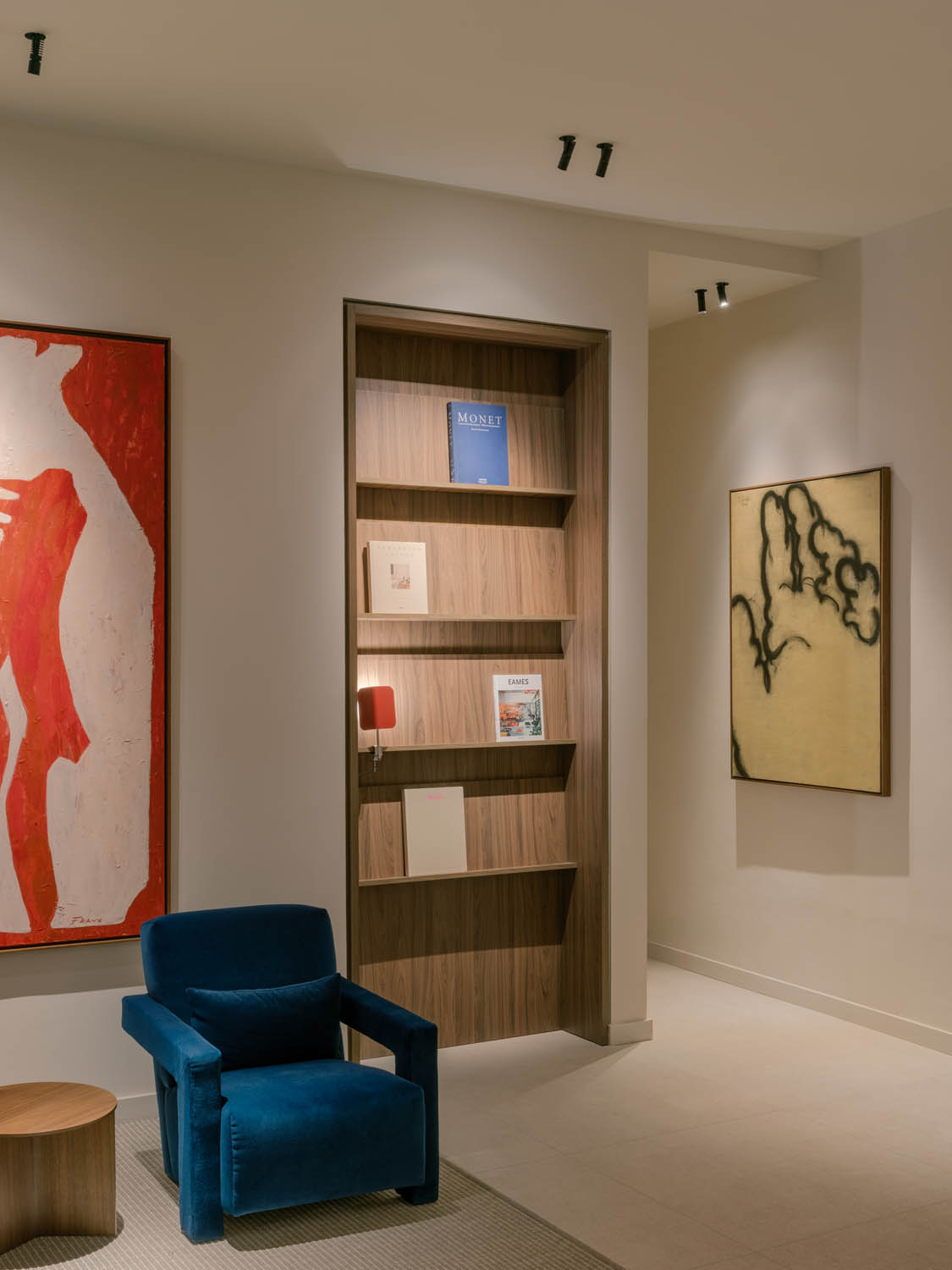 El proyector Uno, de Faro Barcelona, se utiliza para iluminar las paredes y elementos decorativos, proporcionando una luz suave que destaca texturas y colores sin ser invasiva. Para la recepción, se ha optado por la luminaria empotrable Troop, que crea un ambiente de confianza y calidez desde el primer momento.