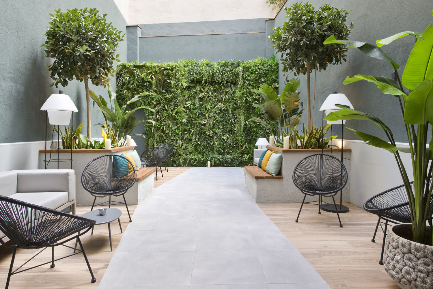 El patio lo preside, un gran mural vegetal, y dos grandes árboles laterales, que ayudan a distribuir el espacio en 4 zonas… cada una con su mobiliario y sus detalles. Además de estar pintado en un verde gris envolvente creando un espacio que permite olvidar que estás en plena ciudad.